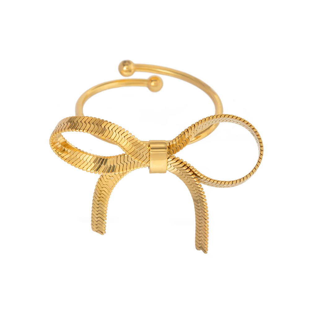 Introducing the 18K Gold-Plated Snake Chain Bowknot Opening Ring—an exquisite blend of simplicity, style, and charm. Crafted with high-quality stainless steel and plated in 18K gold, this ring is both stunning and durable. The delicate bowknot design combined with a sleek snake chain texture creates a unique, trendy look that is perfect for any occasion. Whether you’re attending a party, celebrating an anniversary, or looking for an elegant accessory for everyday wear, this ring will add a touch of grace and sophistication to your outfit.