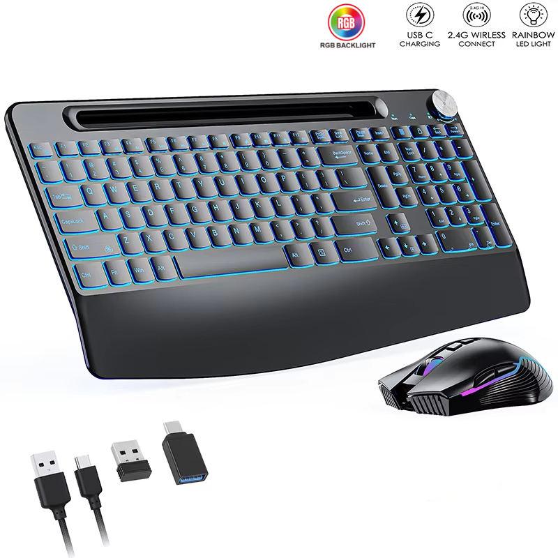 2.4G & USB-C Wireless Keyboard Mouse Combo with RGB Backlit & Wrist Rest