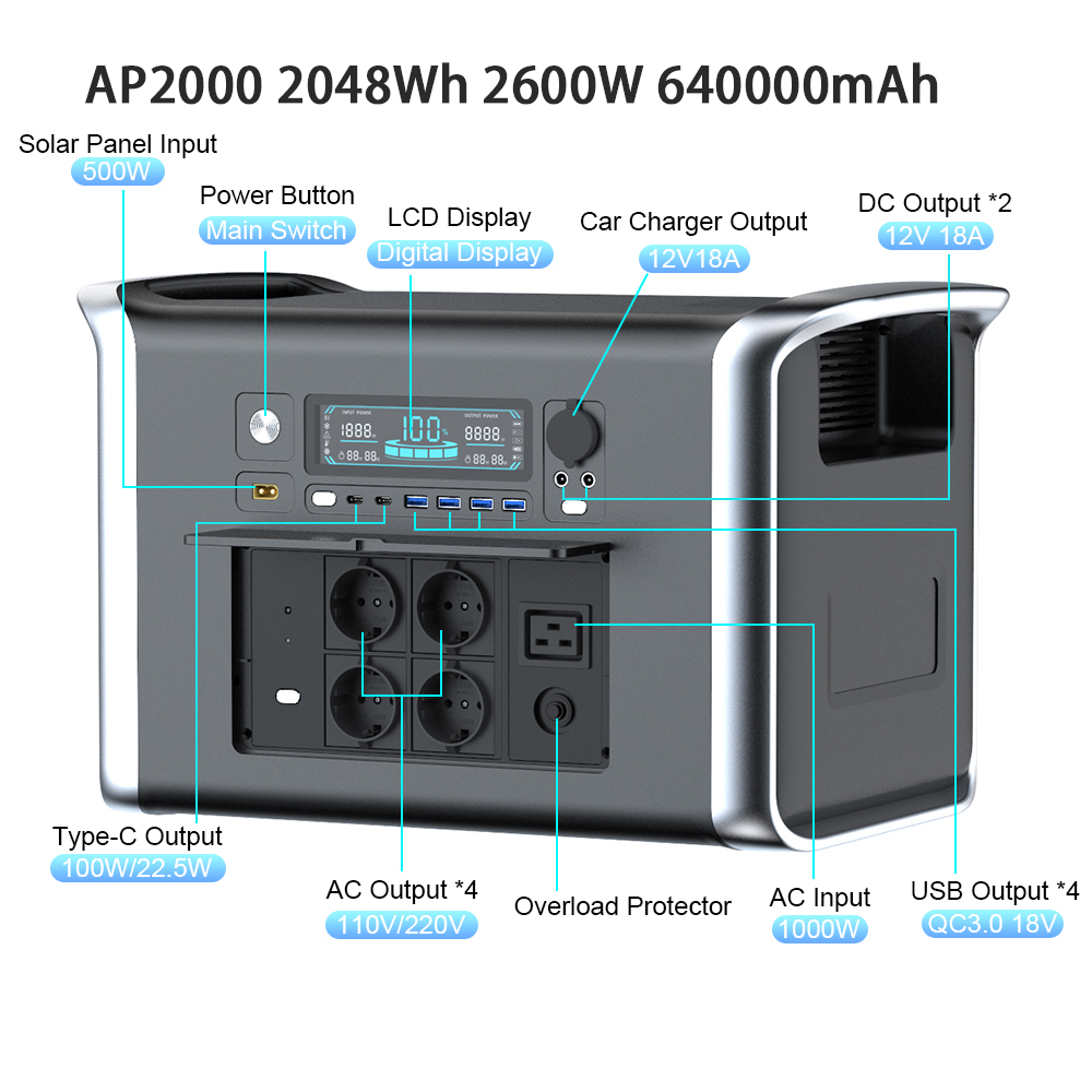 Need reliable power for your outdoor adventures or emergency backup? The 2000W Portable Power Station is your ultimate solution. Designed with a high-capacity LiFePO4 battery, this powerful generator delivers 2048Wh of energy and 2600W output, ensuring you can power your devices, appliances, and even small tools anytime, anywhere. Whether you’re camping, on a road trip, or preparing for a power outage, this station keeps you powered up effortlessly.