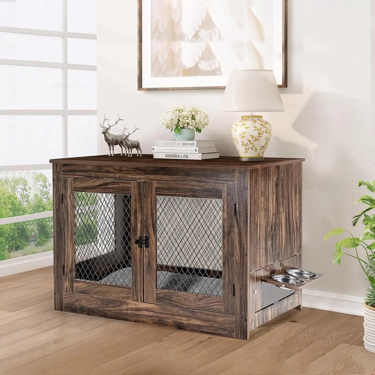 41″ Wooden Dog Crate End Table with 360° Rotatable Bowls, Cushion & Tray – Multi-Functional Pet Furniture