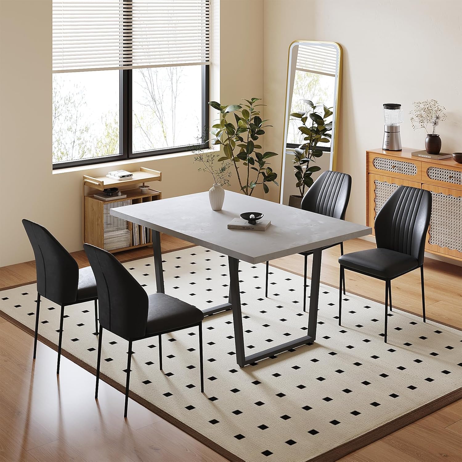 Transform your dining space with this exquisite 5-piece dining table set. Perfect for family meals, gatherings, or casual coffee breaks, this sleek and stylish set brings modern sophistication to your kitchen or dining room. The light gray table and four black PU leather chairs effortlessly complement any home décor, creating an inviting space for unforgettable moments.