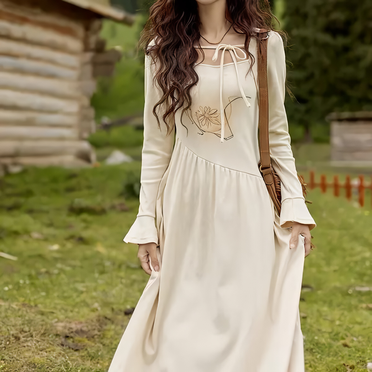 Designed with a square neckline and full-length flare sleeves, this dress brings a touch of French-inspired elegance to your wardrobe. The empire waistline and A-line silhouette enhance your figure, creating a flattering, feminine look that suits a variety of body types. With its mid-calf length, it provides just the right amount of coverage while maintaining a sense of lightness and movement.