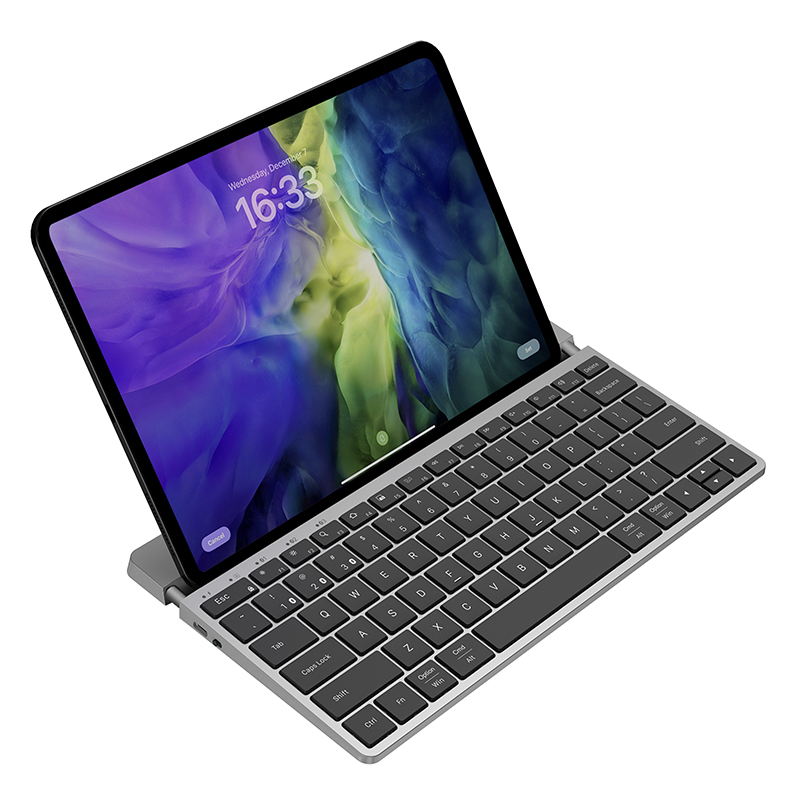 • Integrated Sliding Stand: A sturdy, slide-out cradle holds your tablet or smartphone at the perfect viewing angle for productivity or entertainment.