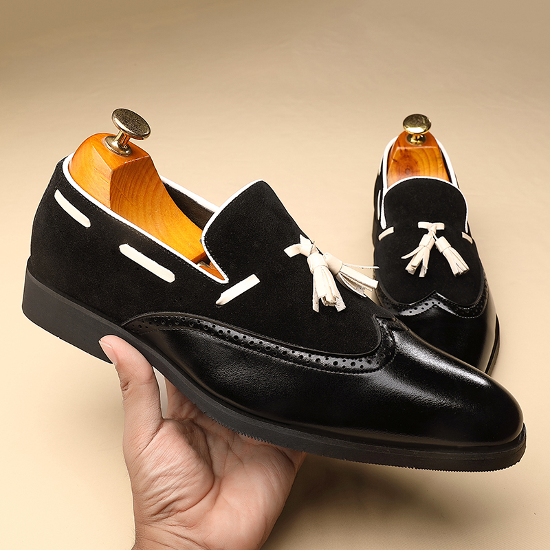 Crafted with premium split leather and detailed with stylish tassels, these loafers exude sophistication. The pointed toe and brogue-inspired detailing add a refined touch, while the mixed colors provide a unique, eye-catching finish. The slip-on design ensures convenience, and the durable rubber outsole gives you the confidence to walk with ease, no matter where your day takes you.