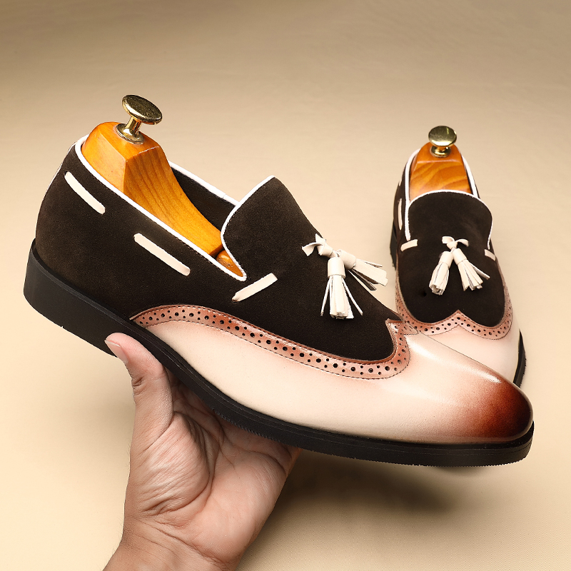 These mixed-color loafers are the perfect blend of style, comfort, and versatility. The brogue detailing and tassel accents bring a traditional elegance, while the bold mix of colors ensures you stand out in any setting. Whether you’re dressing up for a wedding, a business meeting, or any formal occasion, these loafers will make sure you leave a lasting impression. The pointed toe and sleek silhouette offer a refined and modern look, making these shoes a standout addition to any wardrobe.