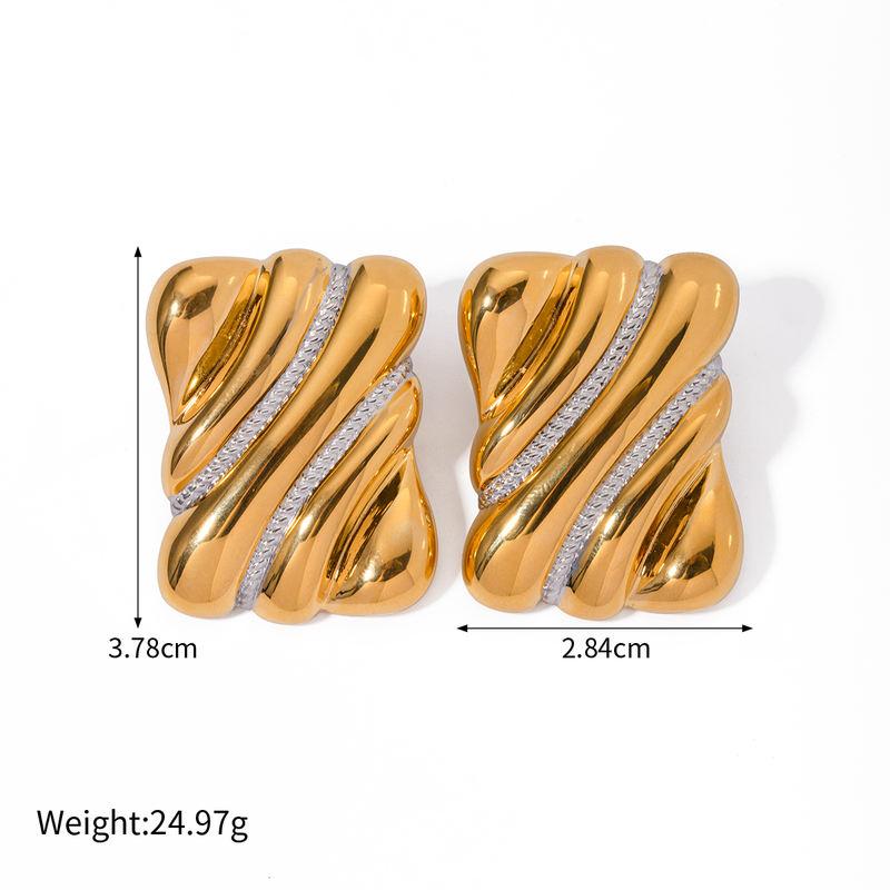 Crafted from durable stainless steel and coated with a luxurious 18K gold plating, these earrings offer a beautiful blend of gold and silver tones, enhancing their appeal with a unique, textured rectangular design. The high-quality materials ensure that these earrings are not only stylish but also resilient, resisting tarnish and scratches while maintaining their radiant shine. Perfectly waterproof, they are designed to keep their stunning appearance no matter the occasion.