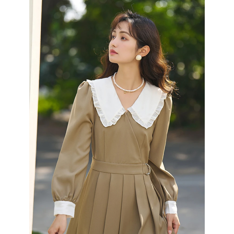 Elegant A-Line Midi Dress with Peter Pan Collar and Belt
