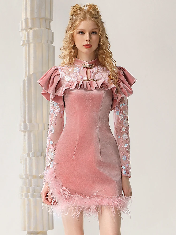 Elegant Court-Style Velvet Cheongsam Dress with Beaded and Feather Details