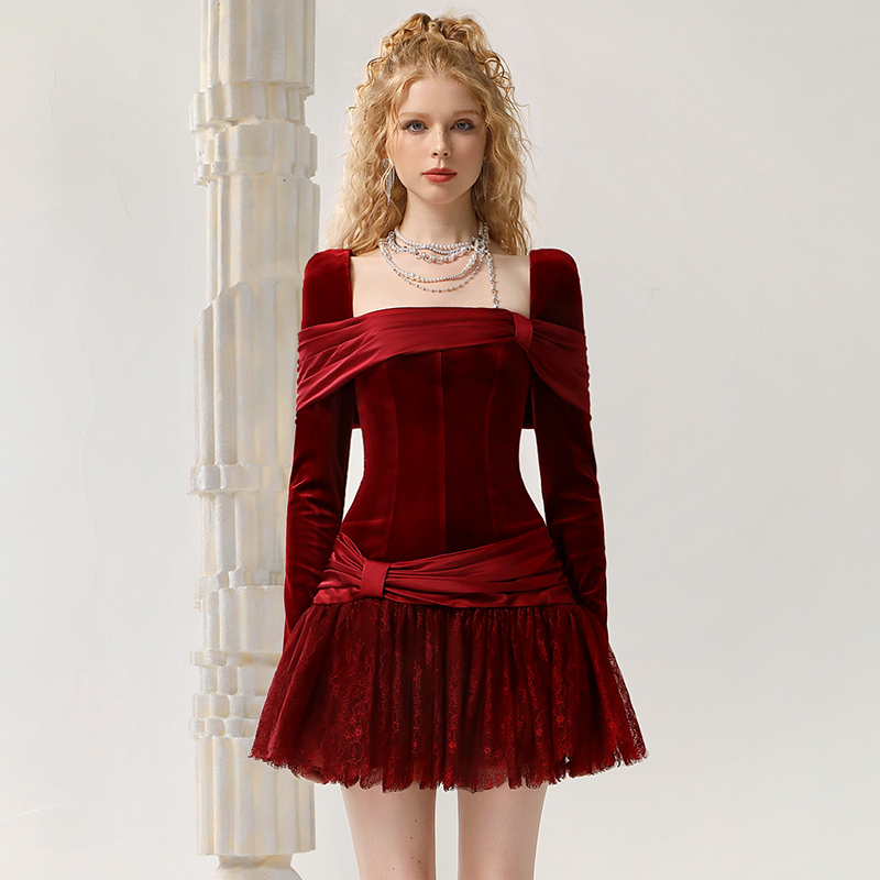 Crafted with precision and attention to detail, this dress is more than just an outfit—it’s a masterpiece of design. The rich red velvet fabric is complemented by a perfectly tailored silhouette and lace splicing, making it both bold and elegant.