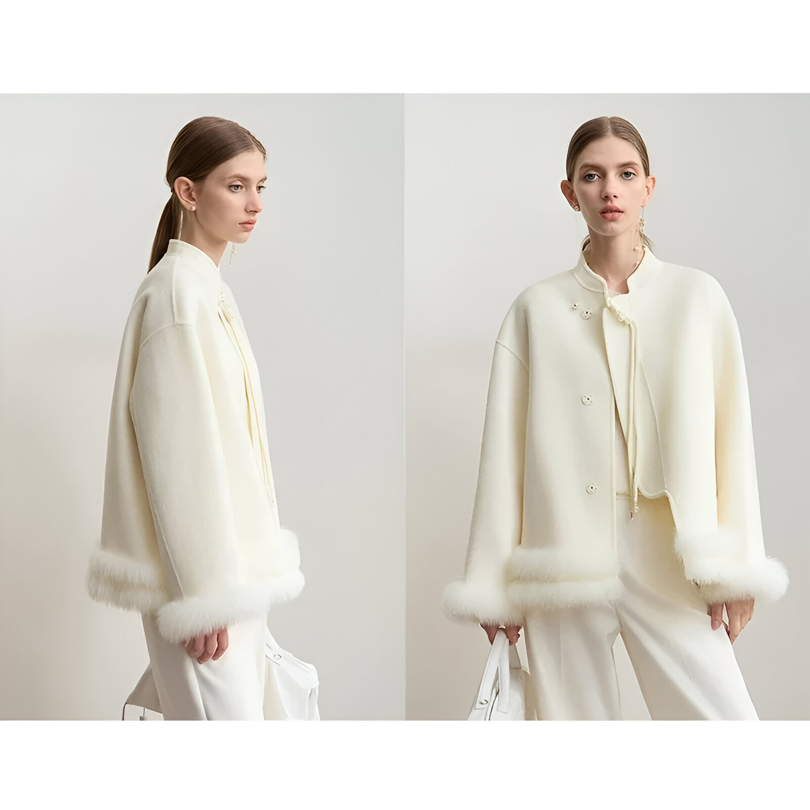 Embrace timeless elegance with this exquisite winter coat, designed to combine classic Chinese-inspired details with modern sophistication. Made from premium wool, this double-sided coat is enhanced with luxurious fox hair accents, offering you both warmth and style. Its pearl buckle and stand-up collar add a touch of refinement, making it a perfect choice for those chilly winter days when you want to stand out in style.