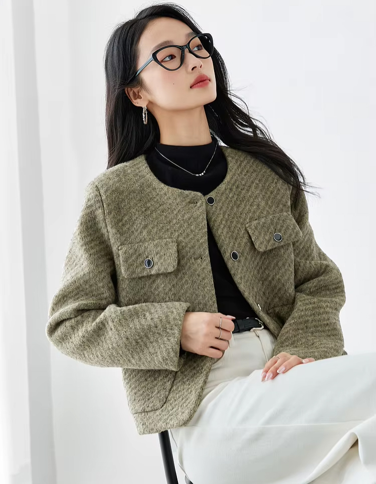 Step into effortless sophistication with this elegant women’s woolen cropped jacket. Designed for the modern office lady, this short blazer exudes charm and professionalism. Its cropped length and tailored fit add a contemporary touch, making it perfect for creating stylish workwear looks or chic casual ensembles. Crafted from a premium blend of polyester, nylon, acrylic, and viscose, this jacket offers warmth and comfort while maintaining a lightweight, polished silhouette.