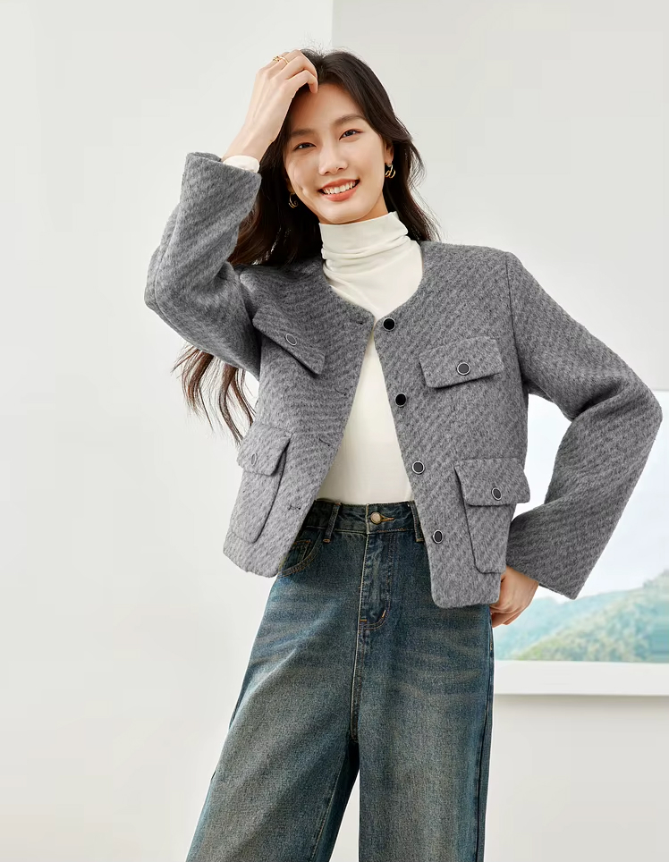 Upgrade your outerwear collection with this versatile woolen cropped jacket. Embrace luxury, functionality, and timeless style all in one piece. Click “Add to Cart” now to bring elegance to your wardrobe.