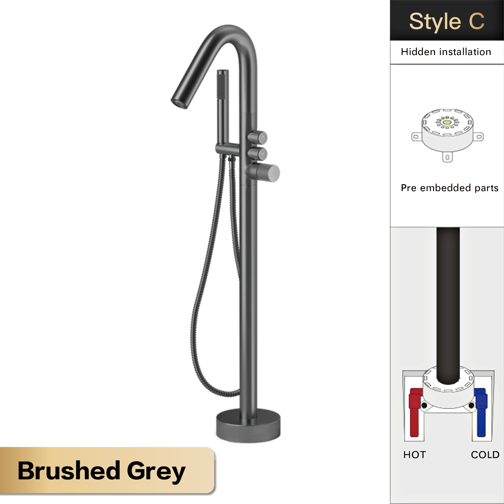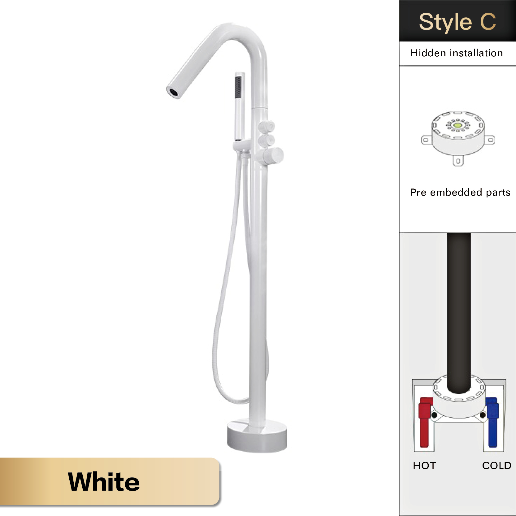 • Floor-Standing Design: Adds a sophisticated and space-saving element to your standalone bathtub setup.
