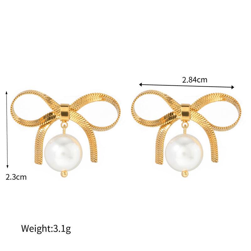 Gold Plated Stainless Steel Bowknot White Pearl Earrings