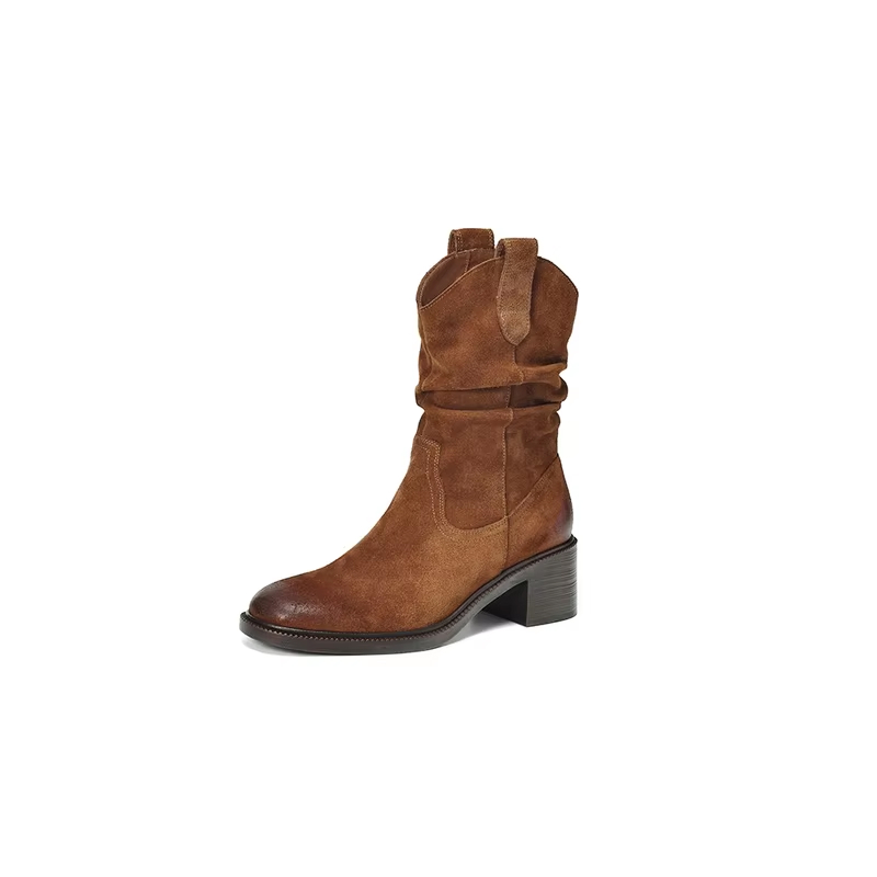 These high-heel cowboy boots are ideal for the winter season but can also be worn year-round. Their retro yet modern design makes them a versatile addition to your wardrobe. From casual outfits to more polished looks, these boots effortlessly elevate any ensemble. The suede material offers a luxurious feel, while the stylish round toe and zipper detail give them a unique flair that’s sure to turn heads wherever you go.