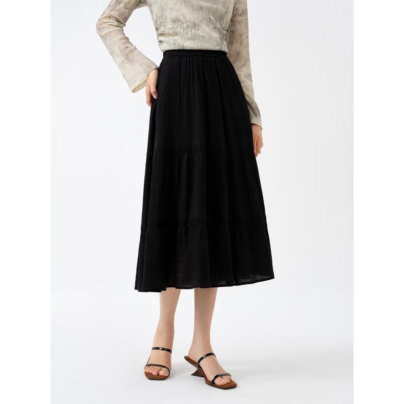This High Waist Black A-Line Skirt is more than just a wardrobe staple; it’s a statement piece that brings together comfort and style. Crafted from a premium blend of Lyocell and polyester, it promises a soft, breathable fabric that feels as good as it looks. The A-line silhouette and mid-calf length create a flattering shape, while the white drape detail adds a sophisticated touch that stands out.