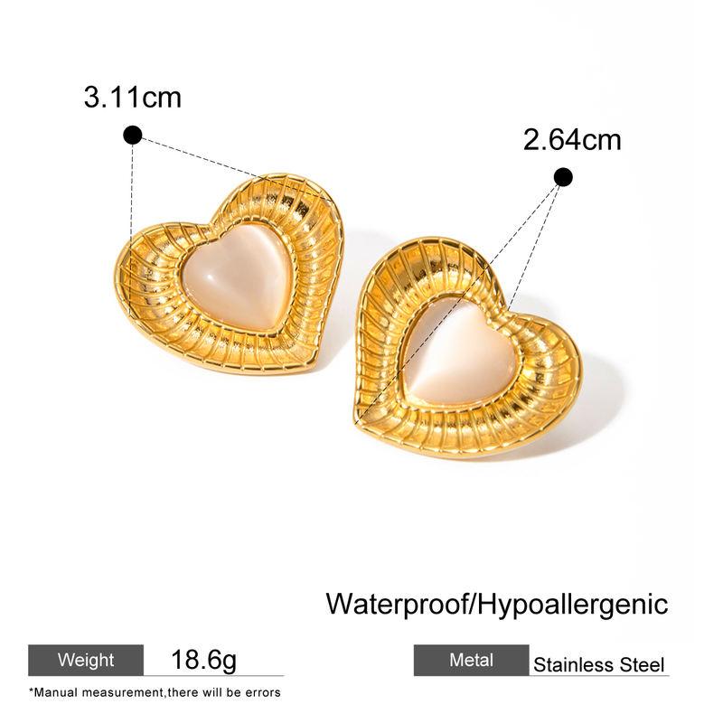 Perfect for weddings, parties, or everyday elegance, these 18K Gold Plated Stainless Steel Love Heart and White Cat Opal Earrings are a must-have for any jewelry lover. Embrace the blend of classic design and modern durability with these charming, waterproof earrings. Add them to your collection or gift them to someone special, and experience the perfect balance of style and sophistication.