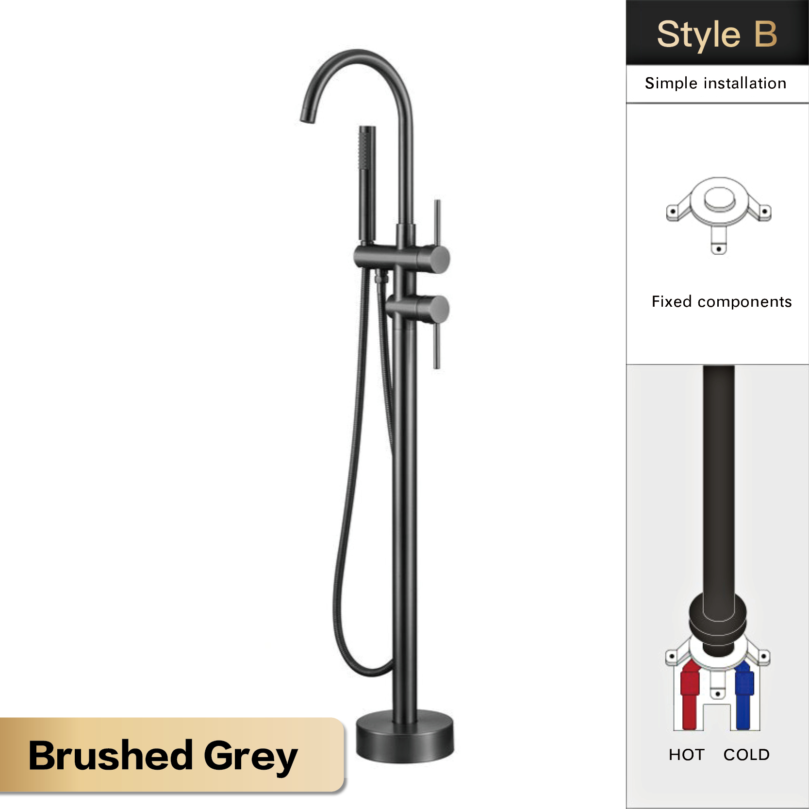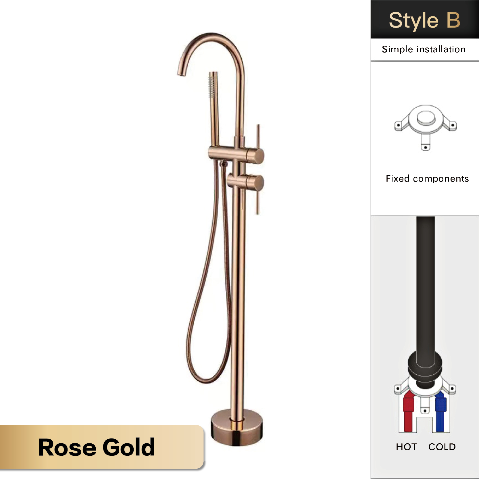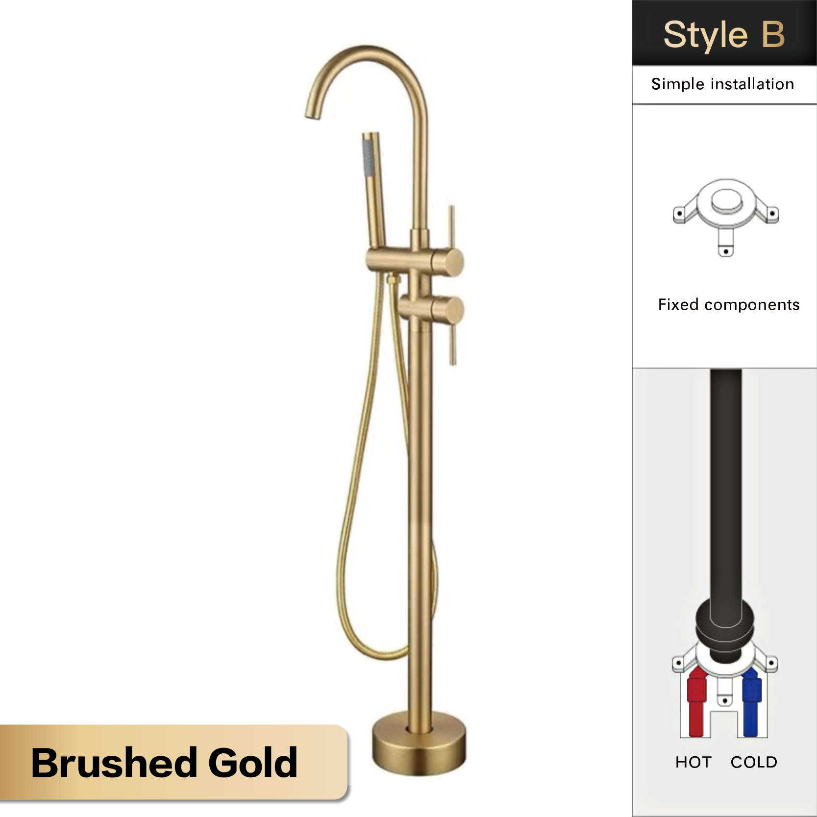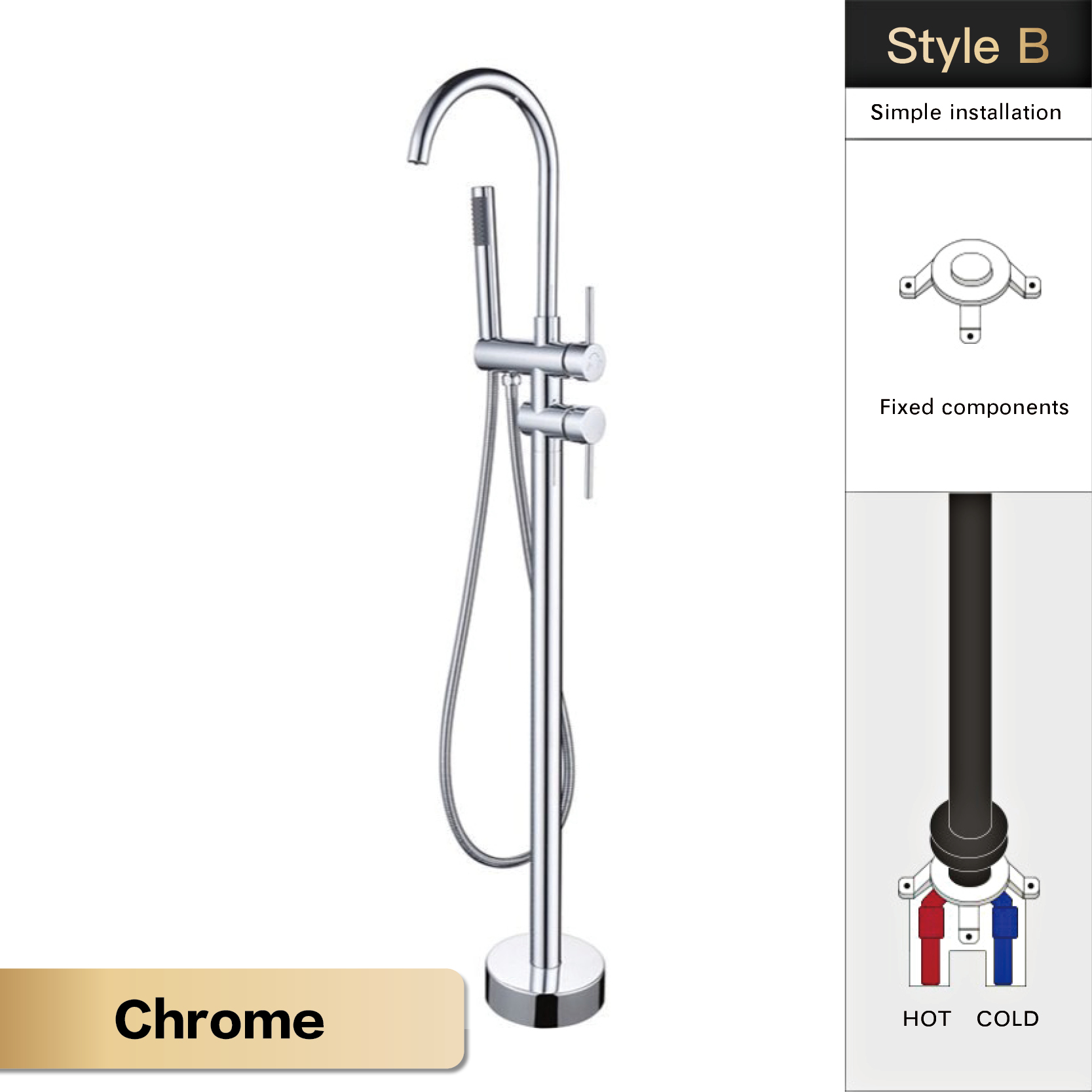 This floor-standing faucet is best used with freestanding bathtubs, making it ideal for modern bathrooms where design and functionality are equally important. The dual-handle setup allows for effortless water control, while the included hand shower adds versatility for tasks like rinsing or cleaning. Its minimalist design fits seamlessly into any décor style, from sleek contemporary spaces to elegant traditional bathrooms.