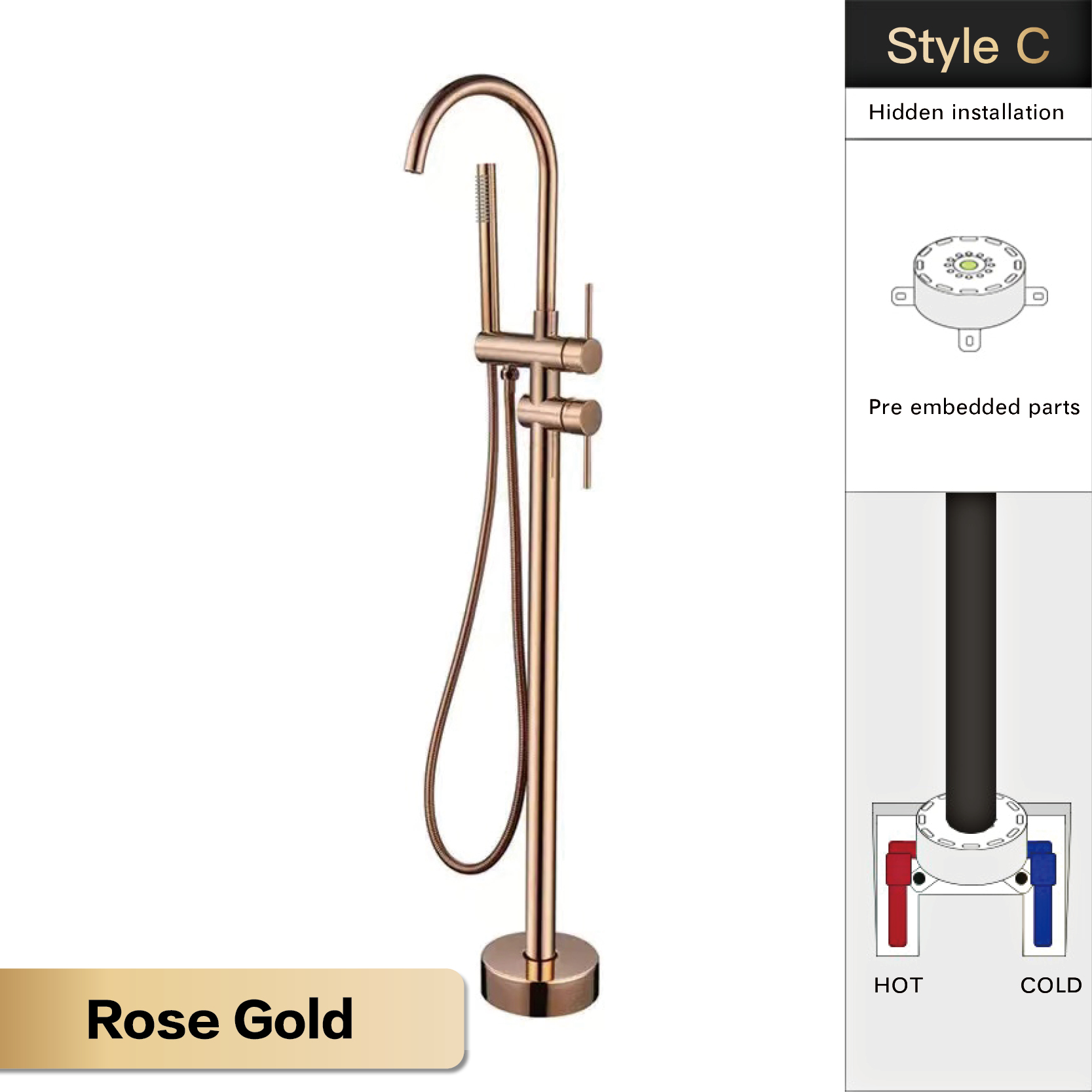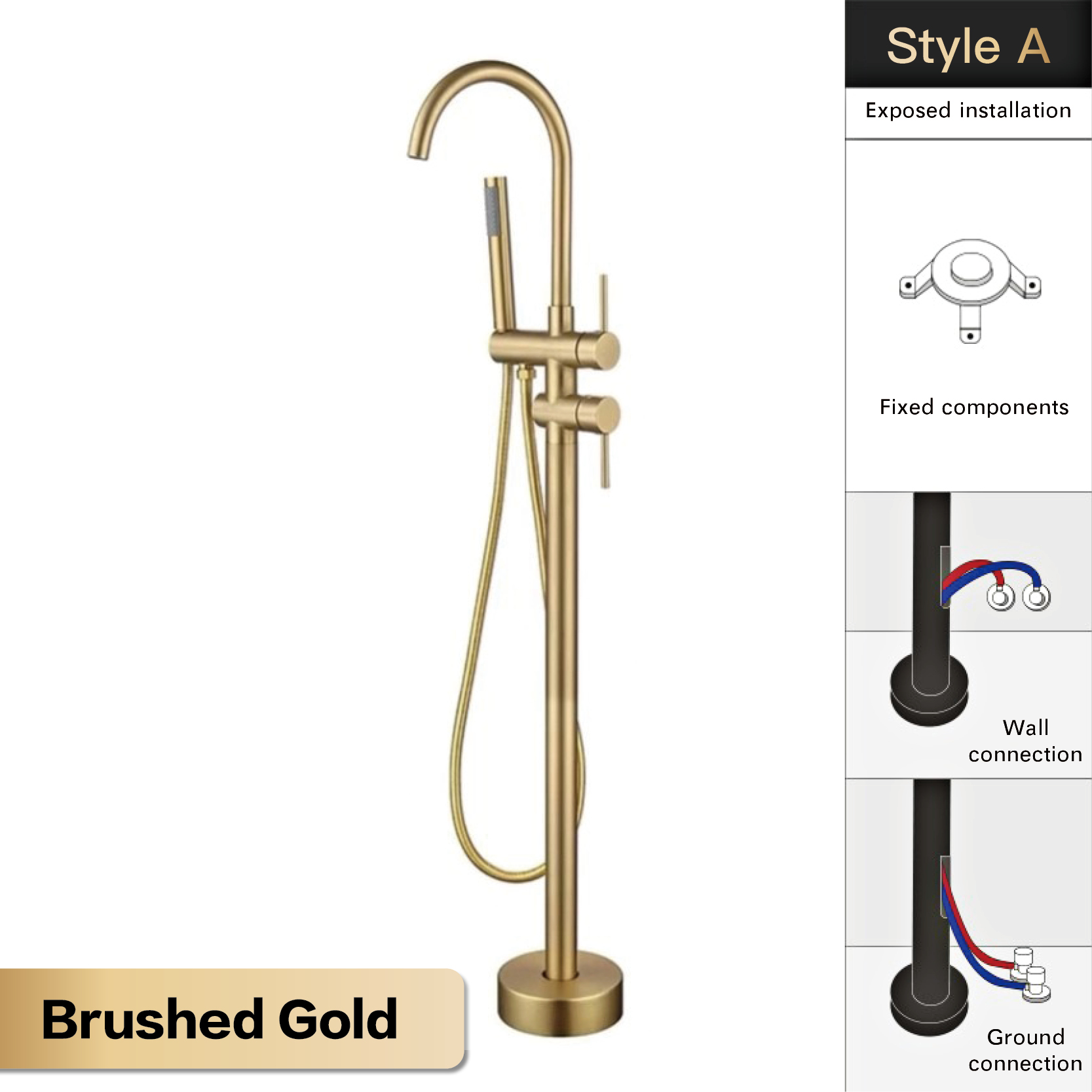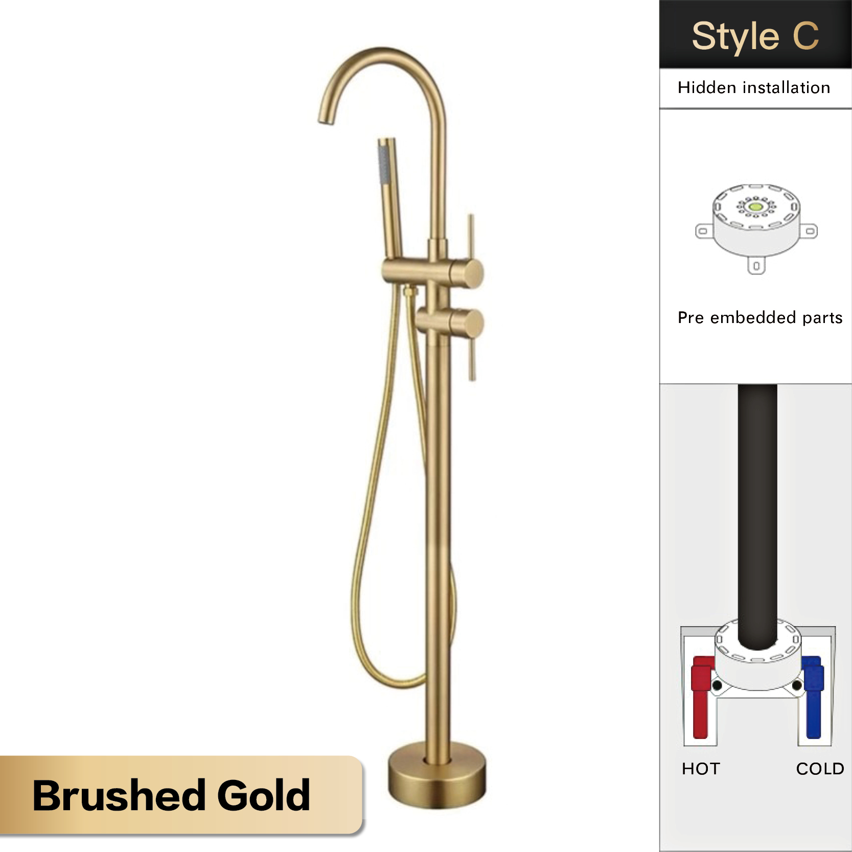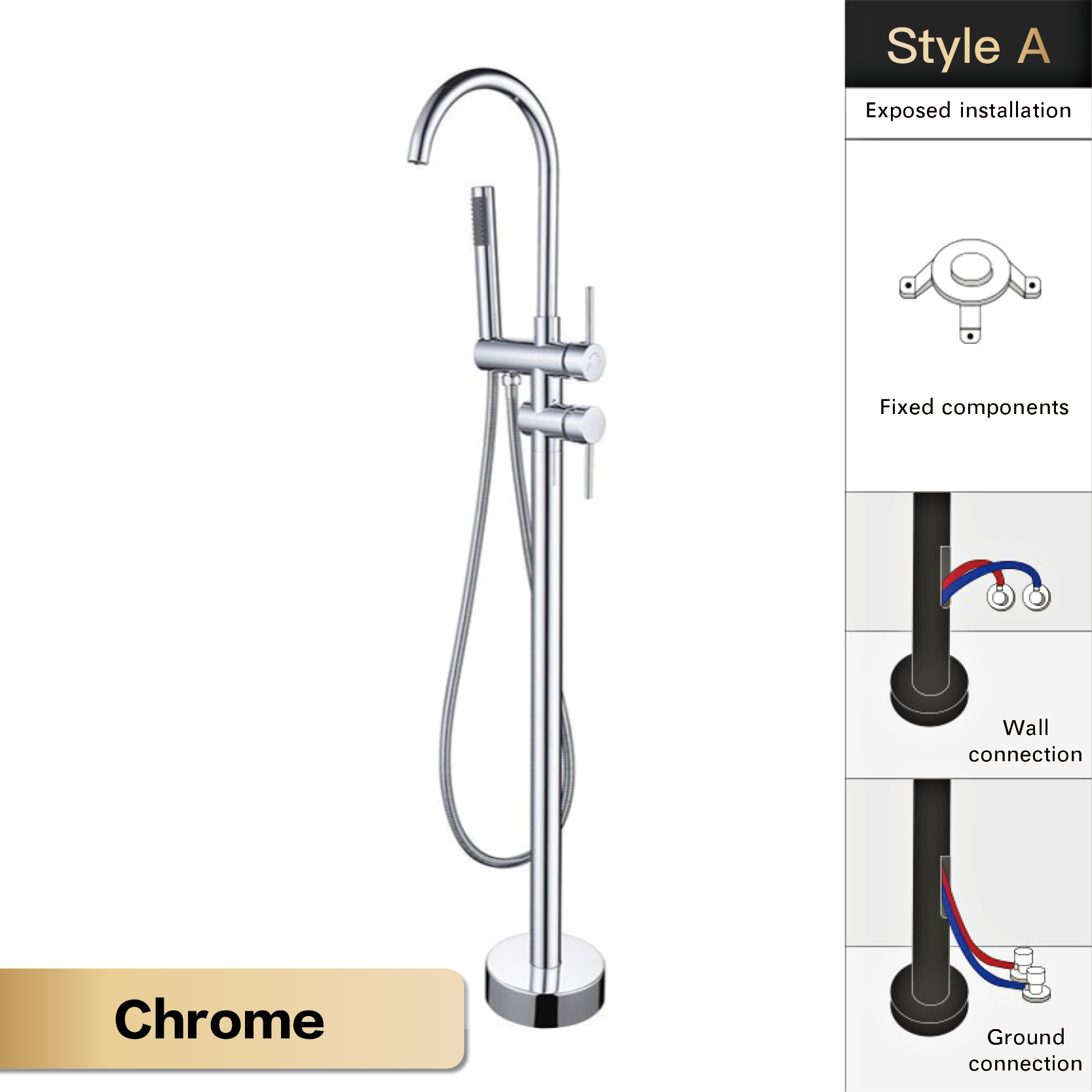 This floor-standing faucet is best used with freestanding bathtubs, making it ideal for modern bathrooms where design and functionality are equally important. The dual-handle setup allows for effortless water control, while the included hand shower adds versatility for tasks like rinsing or cleaning. Its minimalist design fits seamlessly into any décor style, from sleek contemporary spaces to elegant traditional bathrooms.