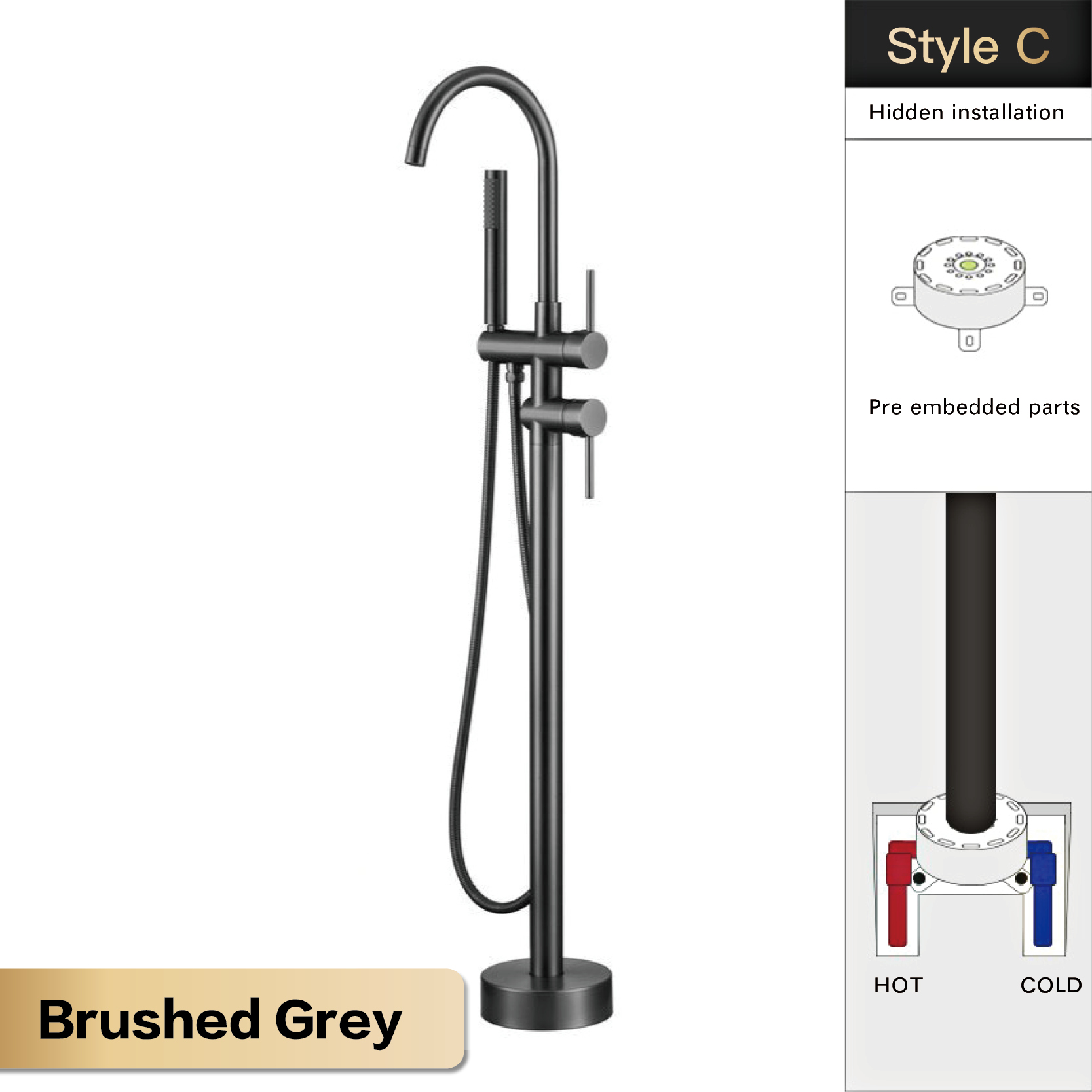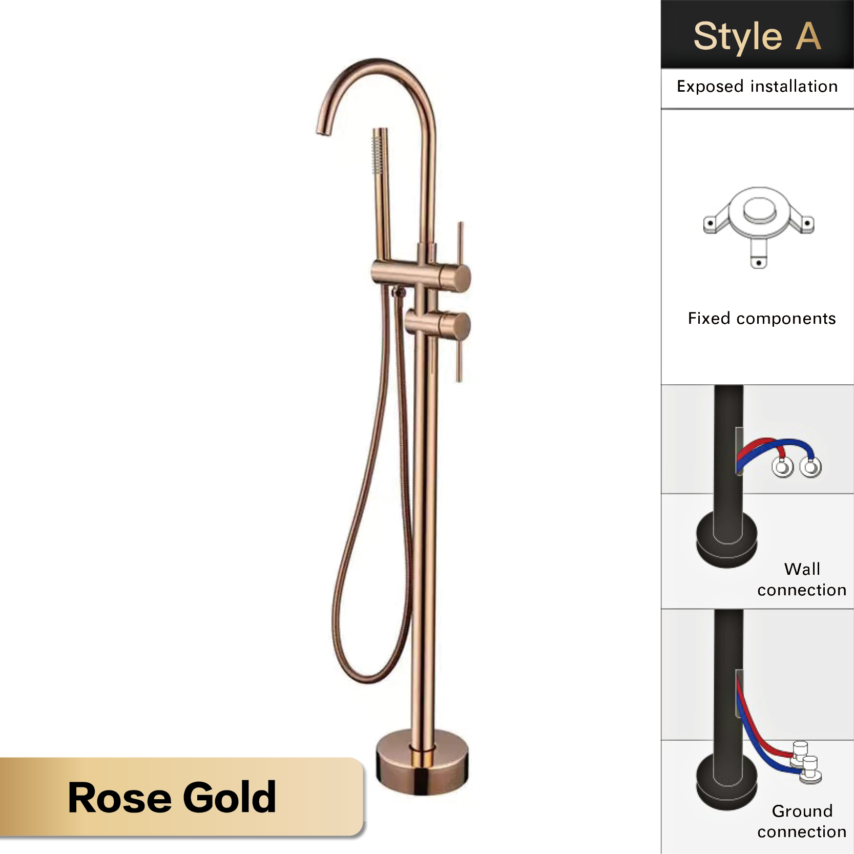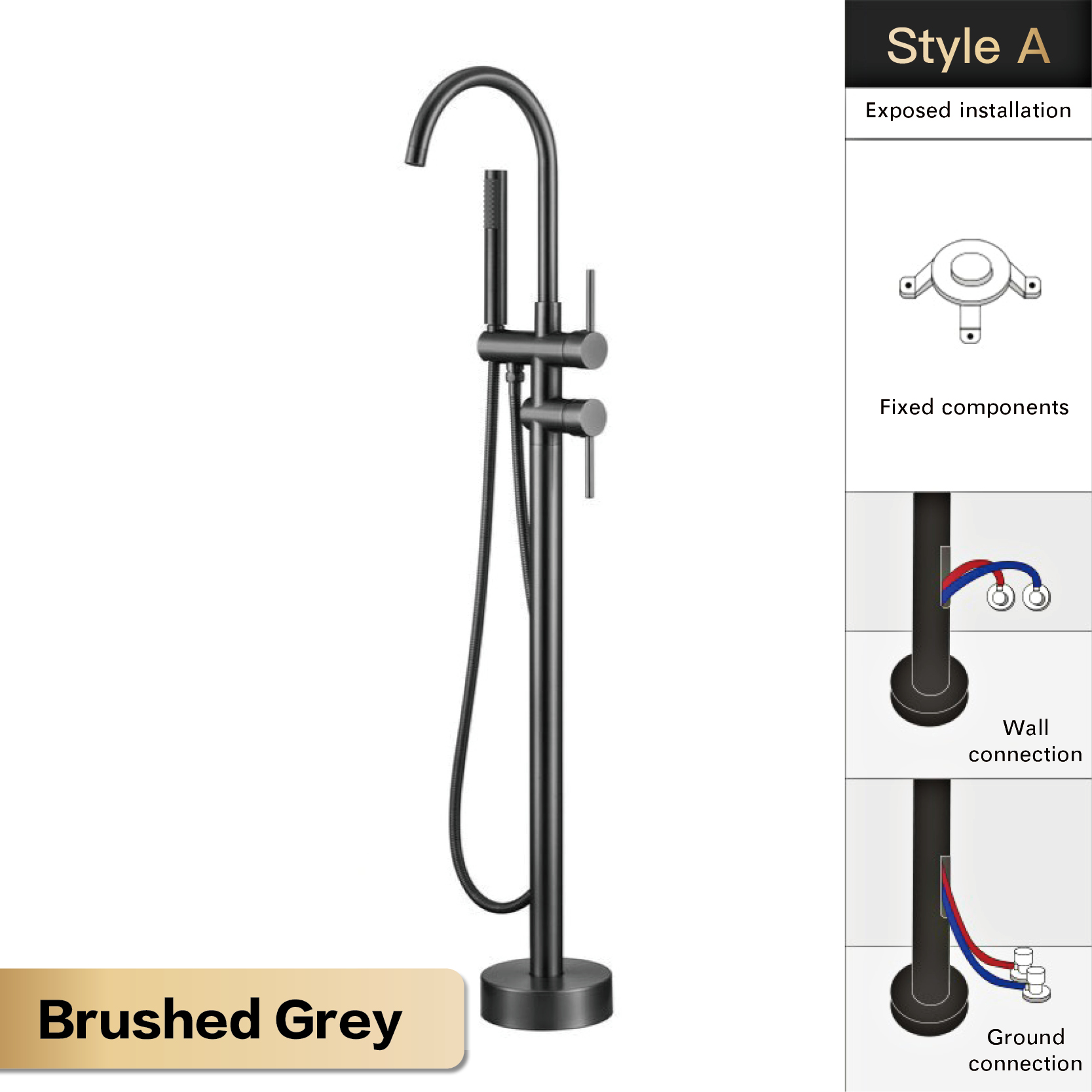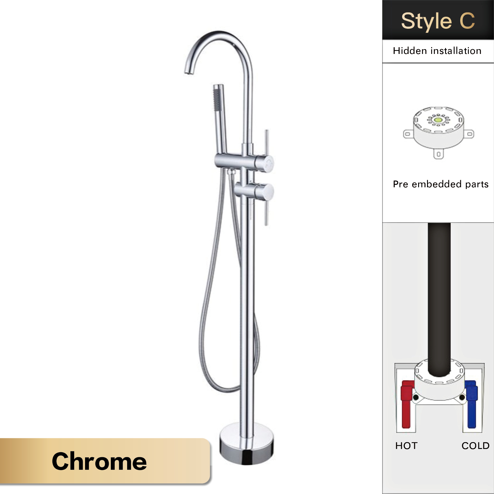This floor-standing faucet is best used with freestanding bathtubs, making it ideal for modern bathrooms where design and functionality are equally important. The dual-handle setup allows for effortless water control, while the included hand shower adds versatility for tasks like rinsing or cleaning. Its minimalist design fits seamlessly into any décor style, from sleek contemporary spaces to elegant traditional bathrooms.