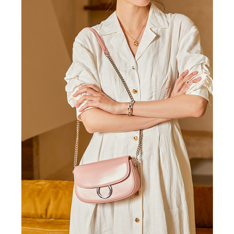 The versatility of the saddle bag style means it can be worn as a shoulder bag or crossbody, adapting to your needs and ensuring comfort and convenience. With its practical interior pockets, you can keep your essentials organized and easily accessible. The sleek, solid colors and trendy metal chain make it a versatile addition to any wardrobe, perfect for transitioning from day to night with ease.