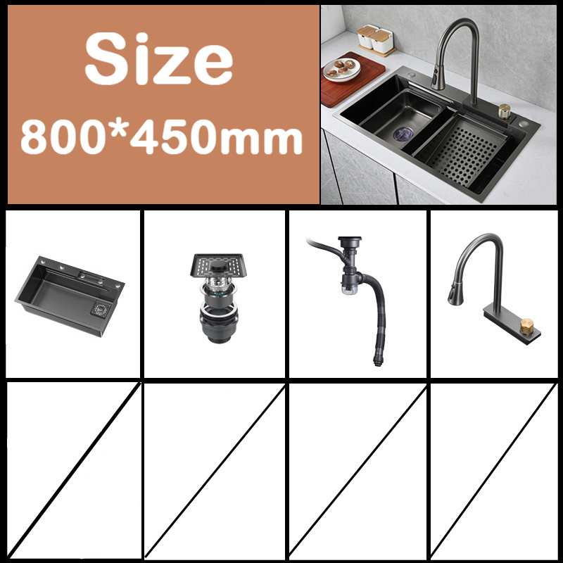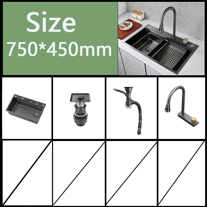 Elevate your kitchen experience with the Modern Black Grey Nano Stainless Steel Kitchen Sink. Designed for both functionality and style, this sink is a statement piece for any kitchen. Whether you are remodeling or upgrading, its sleek design and advanced features make it the ideal choice for discerning homeowners. Available in multiple sizes, this single-bowl sink fits seamlessly into various kitchen layouts, offering both topmount and undermount installation options.