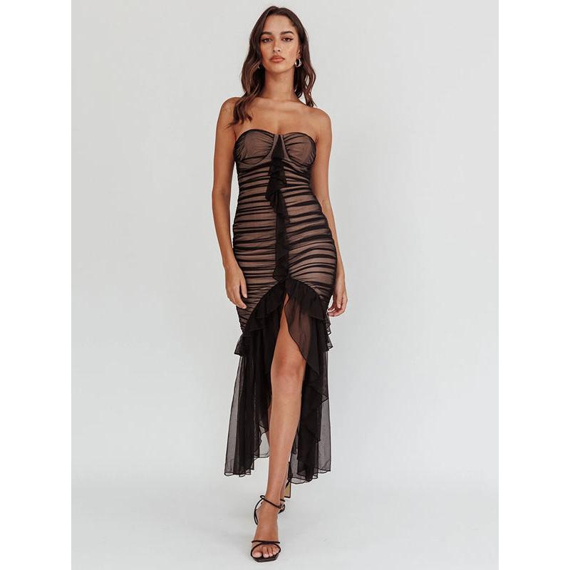 Looking for the perfect dress to make a lasting impression? The Mozision Strapless Mesh Lace Bodycon Midi Dress is a stunning choice for those special nights out. Its sleek silhouette, combined with a backless design and draped mesh detailing, guarantees to bring out your bold, sexy side. Whether you’re headed to a club, a party, or a glamorous evening event, this off-shoulder bodycon dress is your go-to for making a statement.