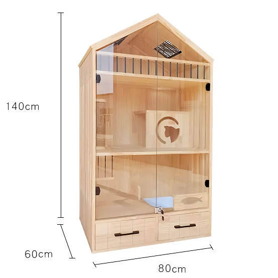 Transform your feline friend’s living space with our Luxury Solid Wood Cat Villa – a premium, multi-level cat house and climbing tower designed to provide endless entertainment and comfort for your beloved pet. Crafted from high-quality wood, this exquisite piece not only serves as a safe haven for your cat but also doubles as an elegant display cabinet, seamlessly blending with your home decor.