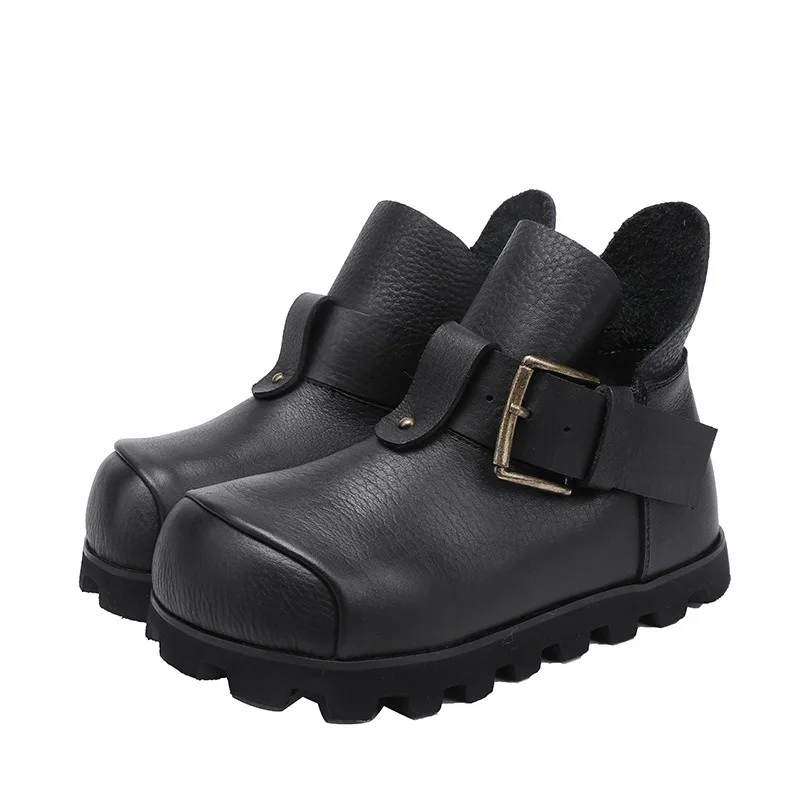 These Retro Buckle Platform Ankle Boots stand out with their invisible heel design that subtly adds height without sacrificing comfort. The flat platform sole ensures effortless walking, while the genuine leather construction promises durability and a touch of luxury. The retro buckle accent brings a nostalgic flair, making these boots a statement piece in your collection.