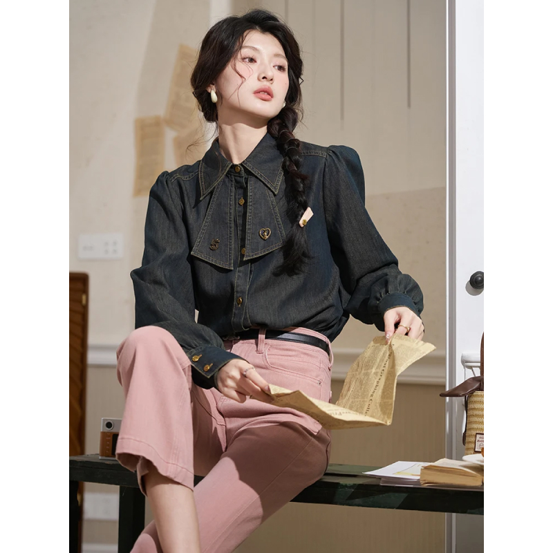 Made from a soft cotton blend, this denim shirt offers comfort without sacrificing style. The retro polo neck adds a classic touch, while the heart-shaped buttons give it a playful, feminine twist. With its loose, relaxed fit, this shirt is perfect for all-day wear. The durable fabric and high-quality construction ensure it will be a long-lasting favorite in your wardrobe.