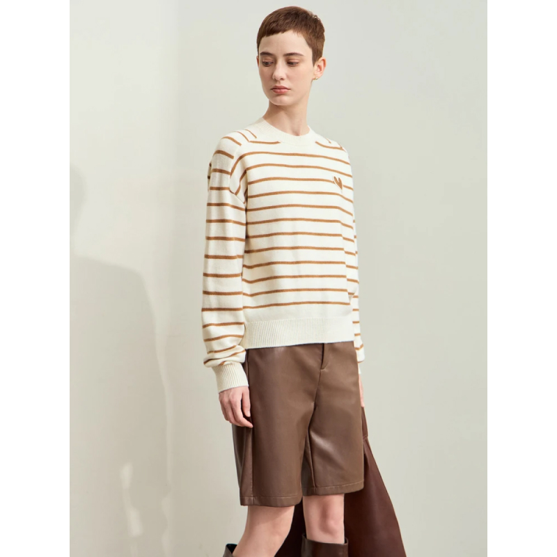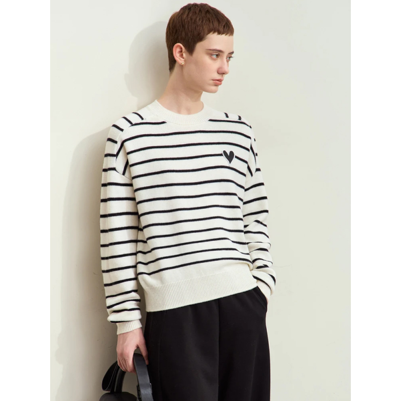 This Striped Wool Crewneck Sweater offers a blend of classic design and modern details, making it a versatile addition to your wardrobe. Its loose fit and soft wool material provide all-day comfort, while the striped pattern and embroidery add a sophisticated touch. Perfect for layering over your favorite jeans or skirts, this sweater easily transitions from casual outings to more polished looks. Its timeless design ensures you’ll reach for it season after season, making it a smart investment for your fall and winter attire.