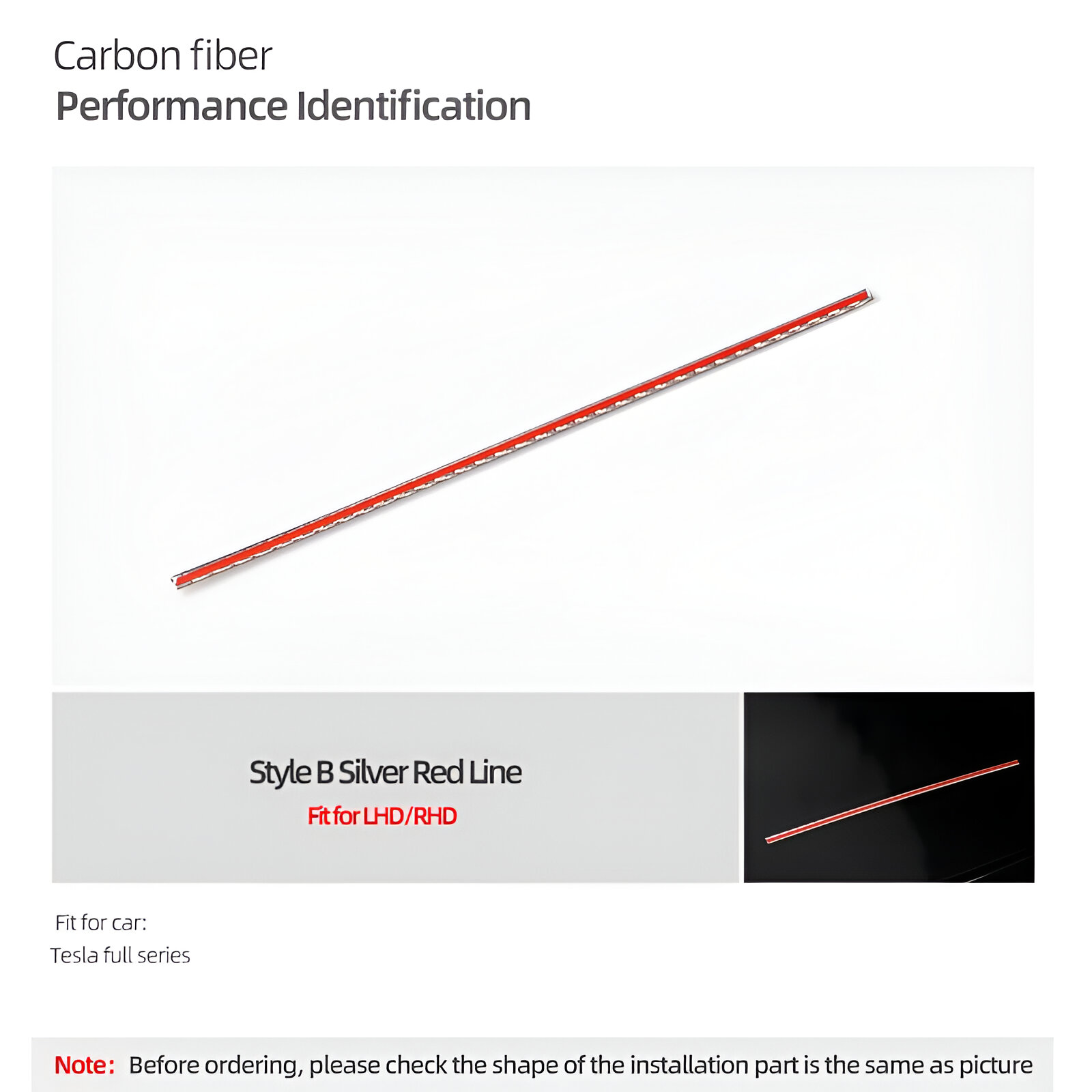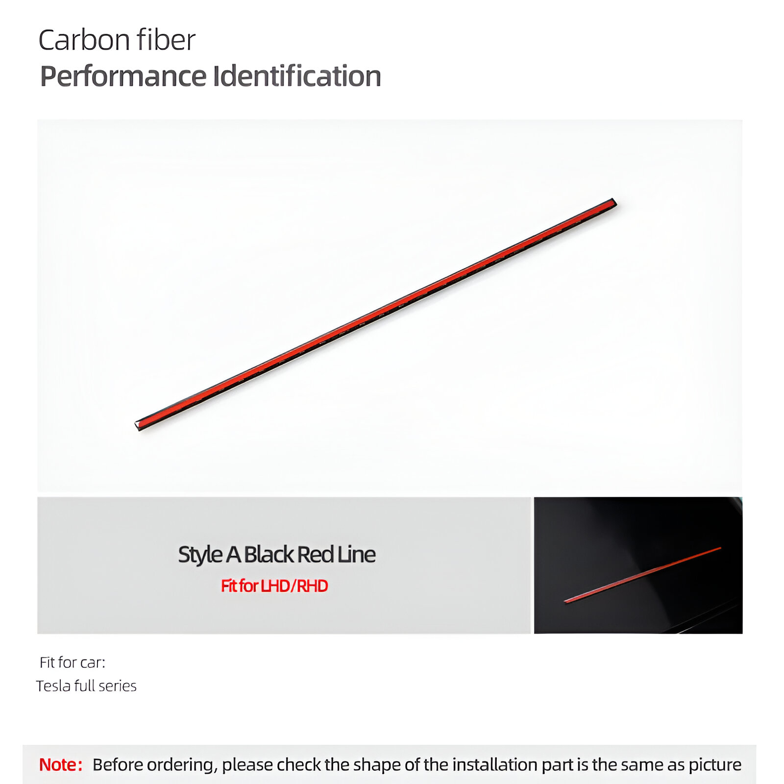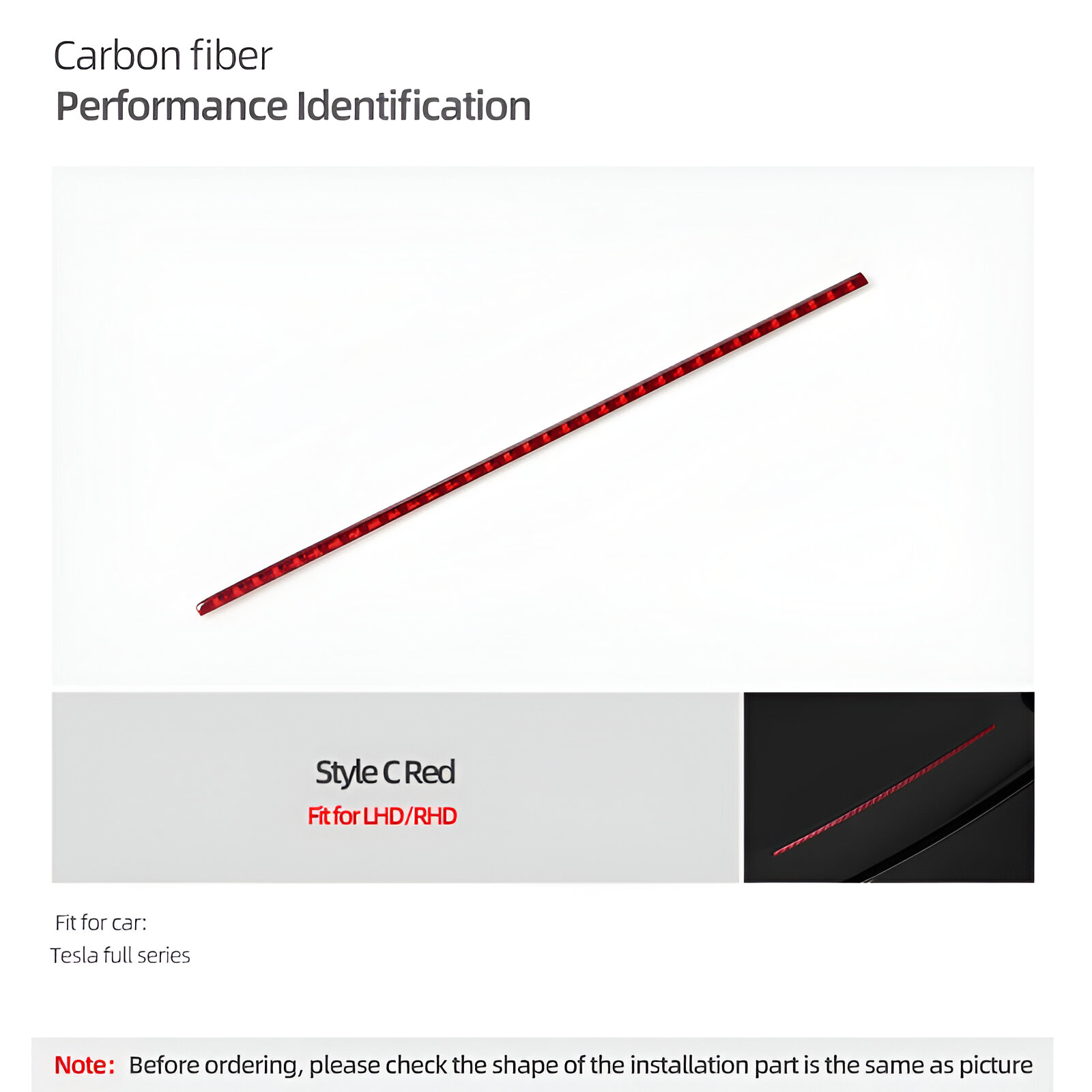 This sleek performance identification panel sticker is more than just a decoration—it’s a statement of power and precision. The dynamic contours and exclusive red performance markings echo the energy and precision of a supercar. The carbon fiber material used in this trim piece is the same high-performance material found in million-dollar supercars, giving your Tesla a truly premium look and feel.