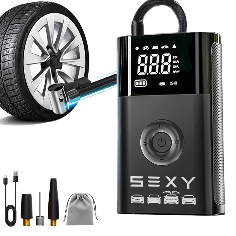 Imagine being stuck with low tire pressure in the middle of nowhere. No more searching for gas stations or waiting for roadside assistance! This cordless and rechargeable air pump lets you inflate your tires anywhere, anytime—fast and hassle-free. Its sleek, Tesla-inspired design fits perfectly in your car without taking up space.