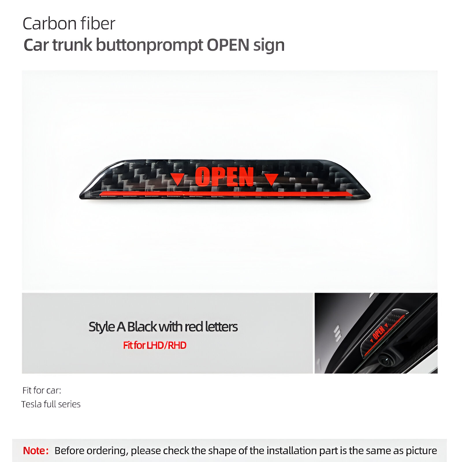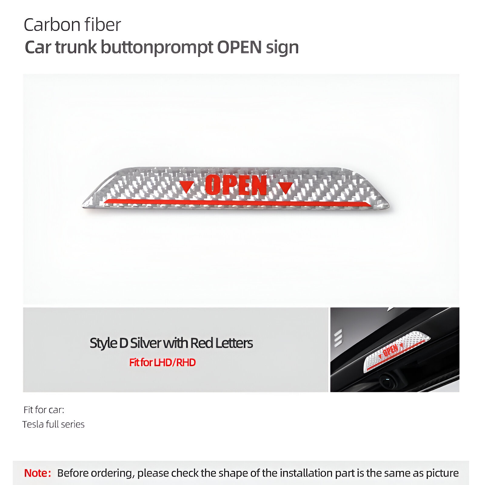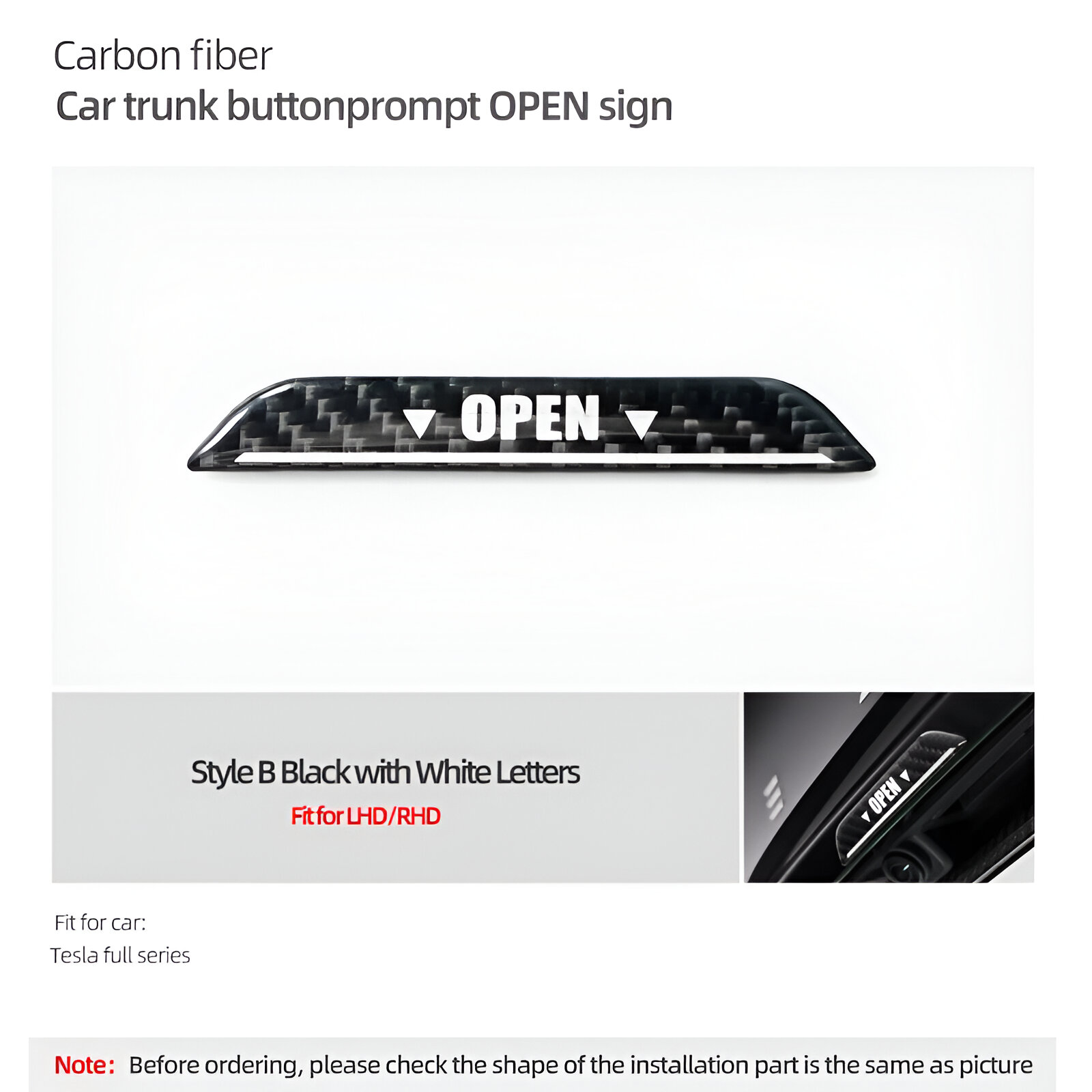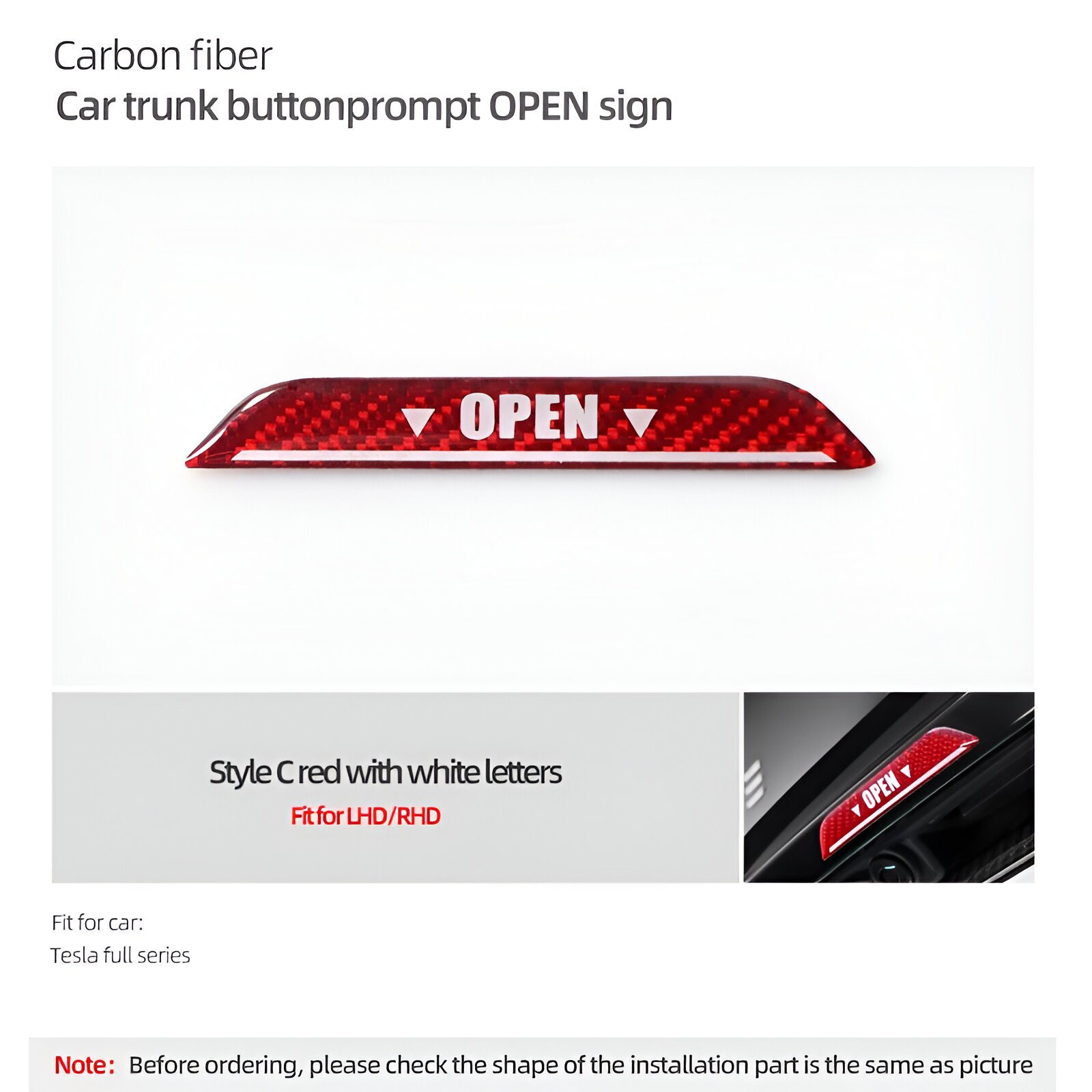 Made from durable resin and carbon fiber, this sticker combines the aesthetics of premium supercar materials with a sleek, modern design. The high-quality carbon fiber ensures that this piece not only looks amazing but is built to last. The retro-reflective OPEN logo adds a unique touch of sophistication while offering superior visibility in low light conditions, giving your Tesla an athletic edge in every detail.