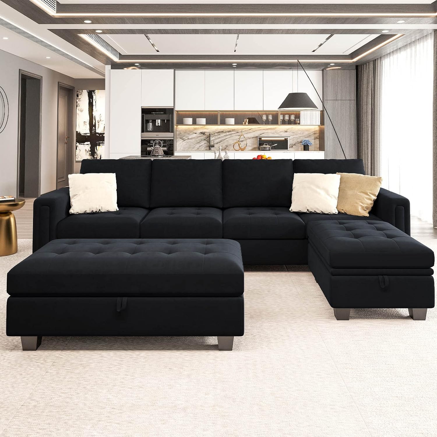 Redefine your living room with this stylish, space-saving Velvet Convertible 4-Seat Sectional Sofa. With a reversible chaise and two storage ottomans, this modern L-shaped couch combines comfort, functionality, and style effortlessly. Whether you’re lounging, hosting friends, or enjoying a movie night, this sectional sofa provides the ultimate relaxation spot with its cozy, deep cushions and plush velvet upholstery.
