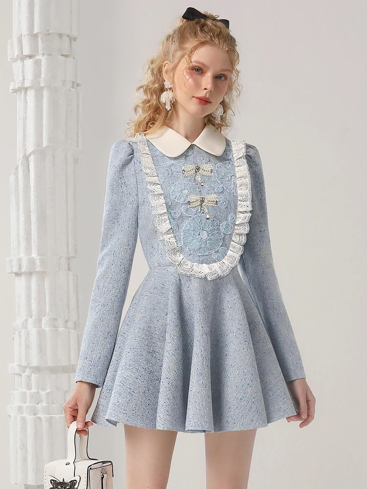 Vintage Long-Sleeve Lace Short Dress with Doll Collar